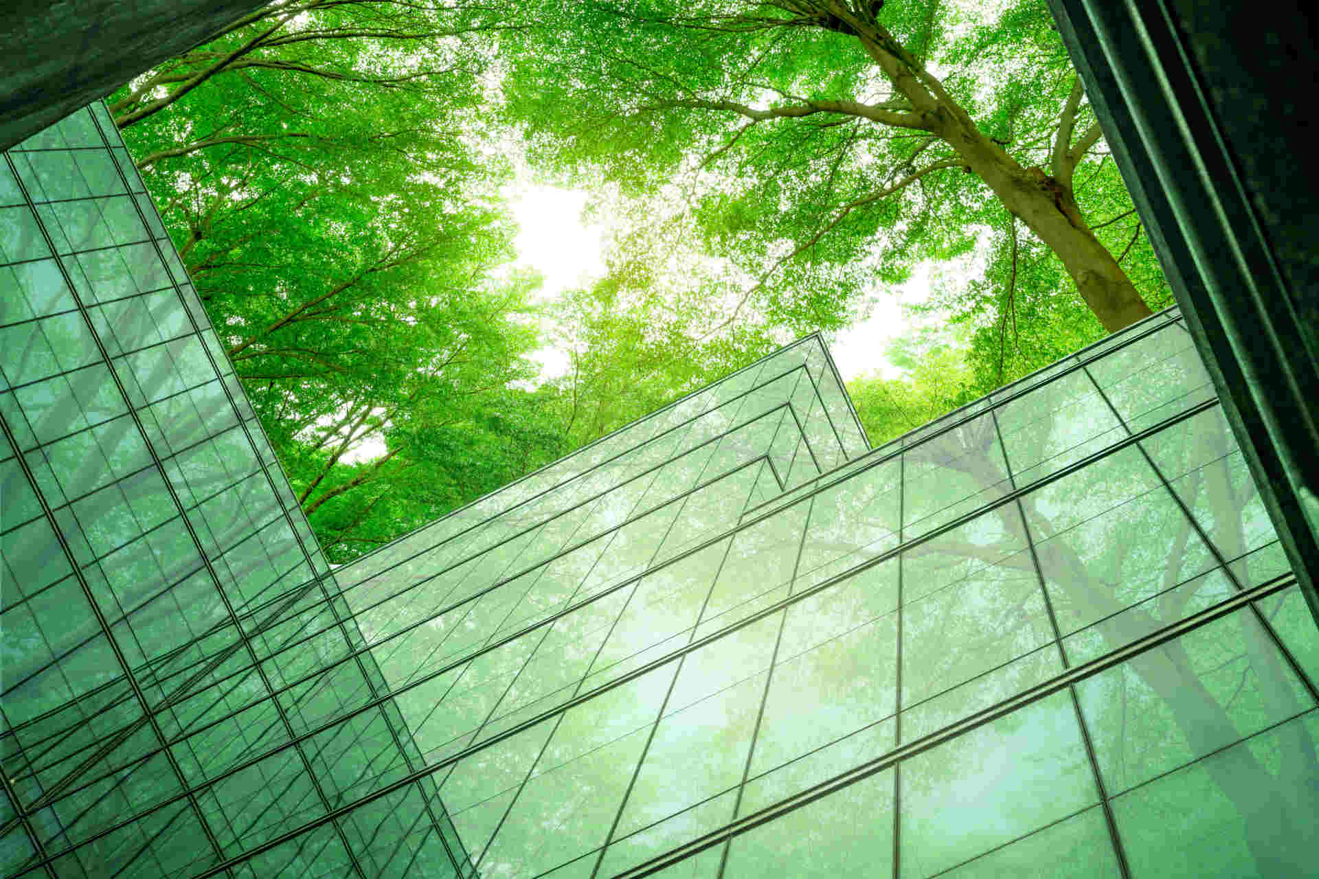 Eco-friendly building in the modern city. Sustainable glass office building with tree for reducing heat and carbon dioxide. Office building with green environment. Corporate building reduce CO2.