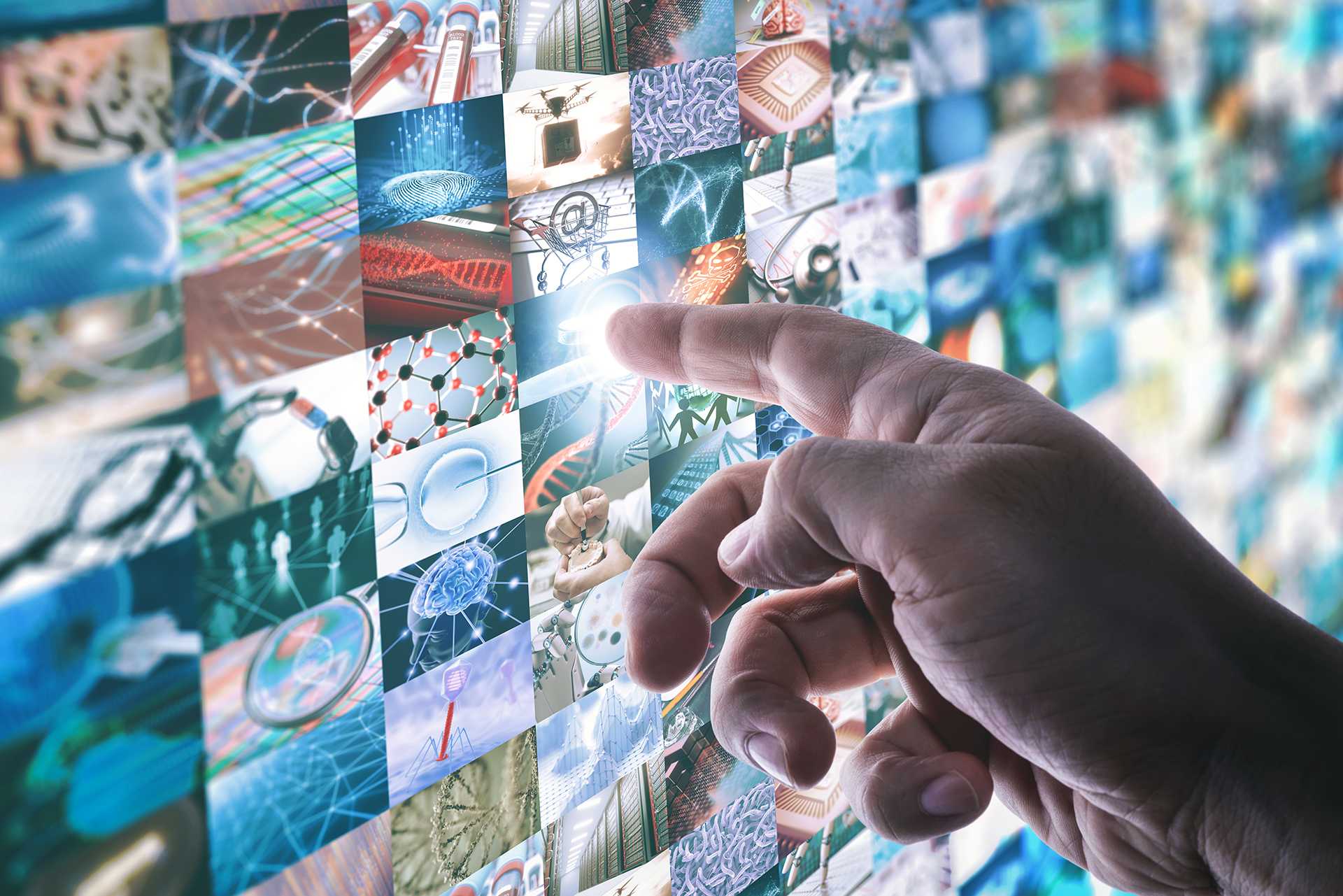Due mani che si toccano, una umana e una fatta di strutture chimiche